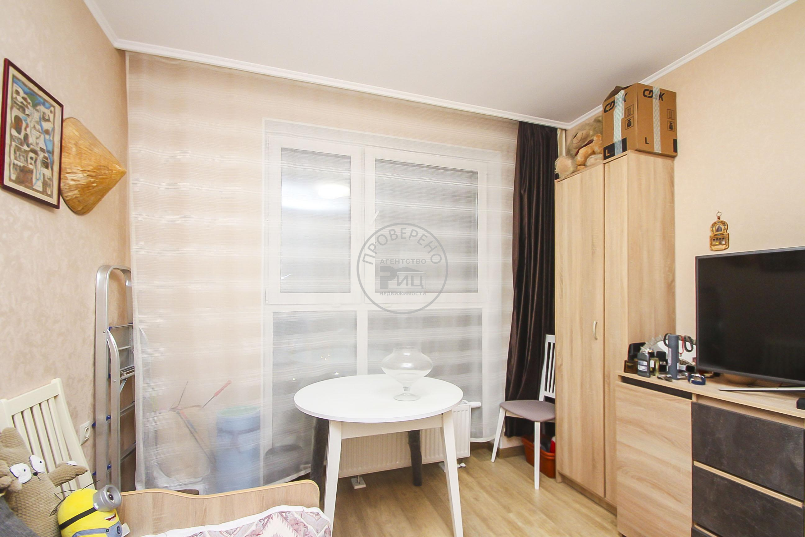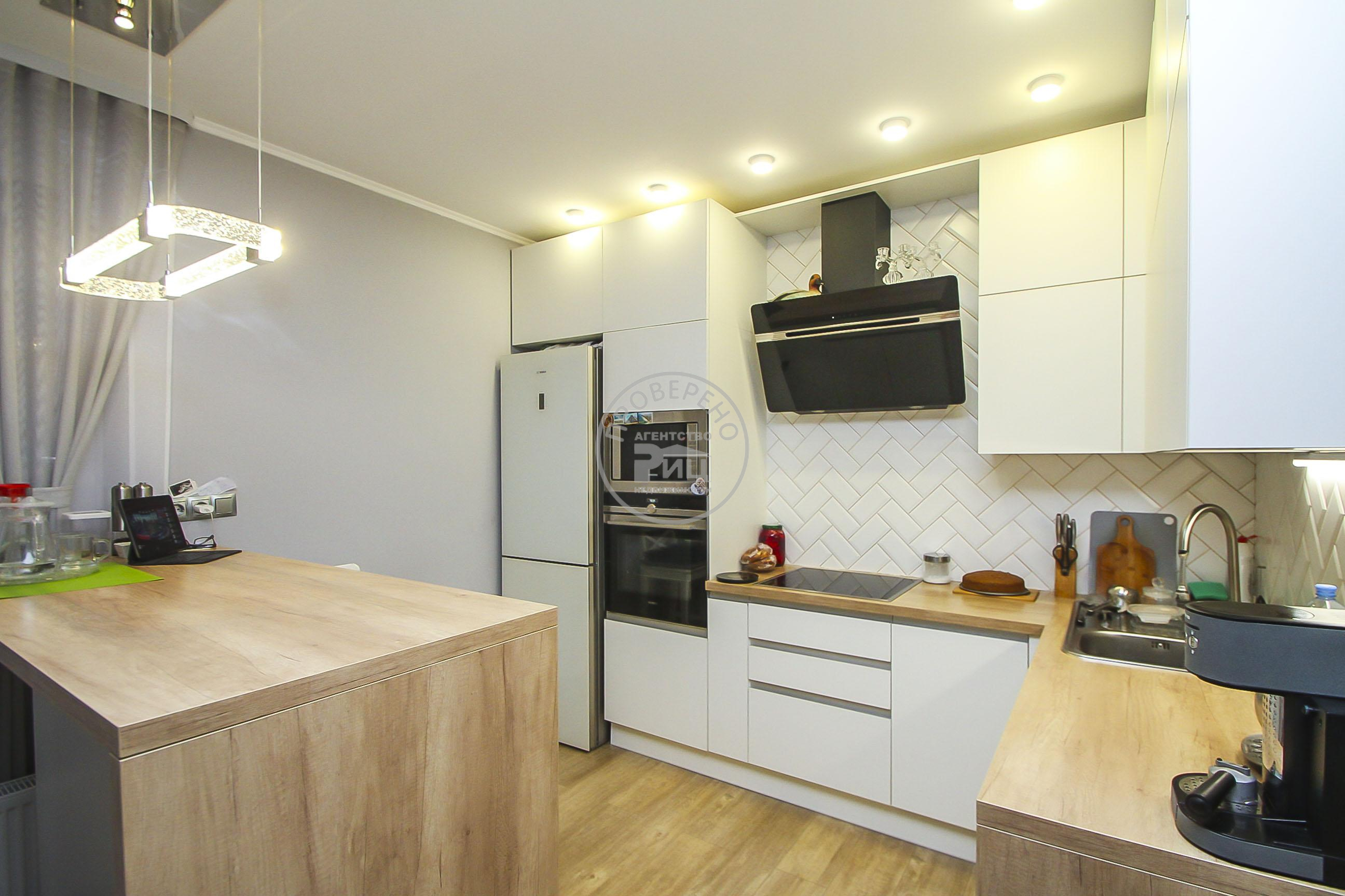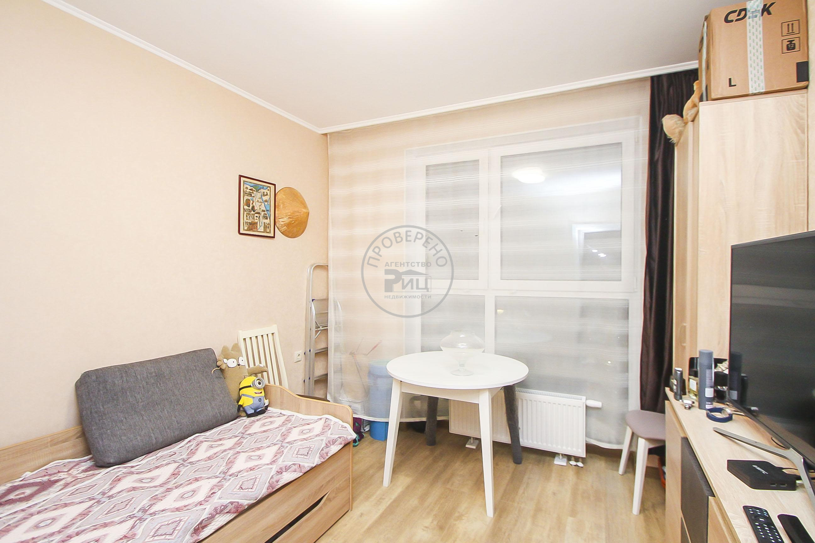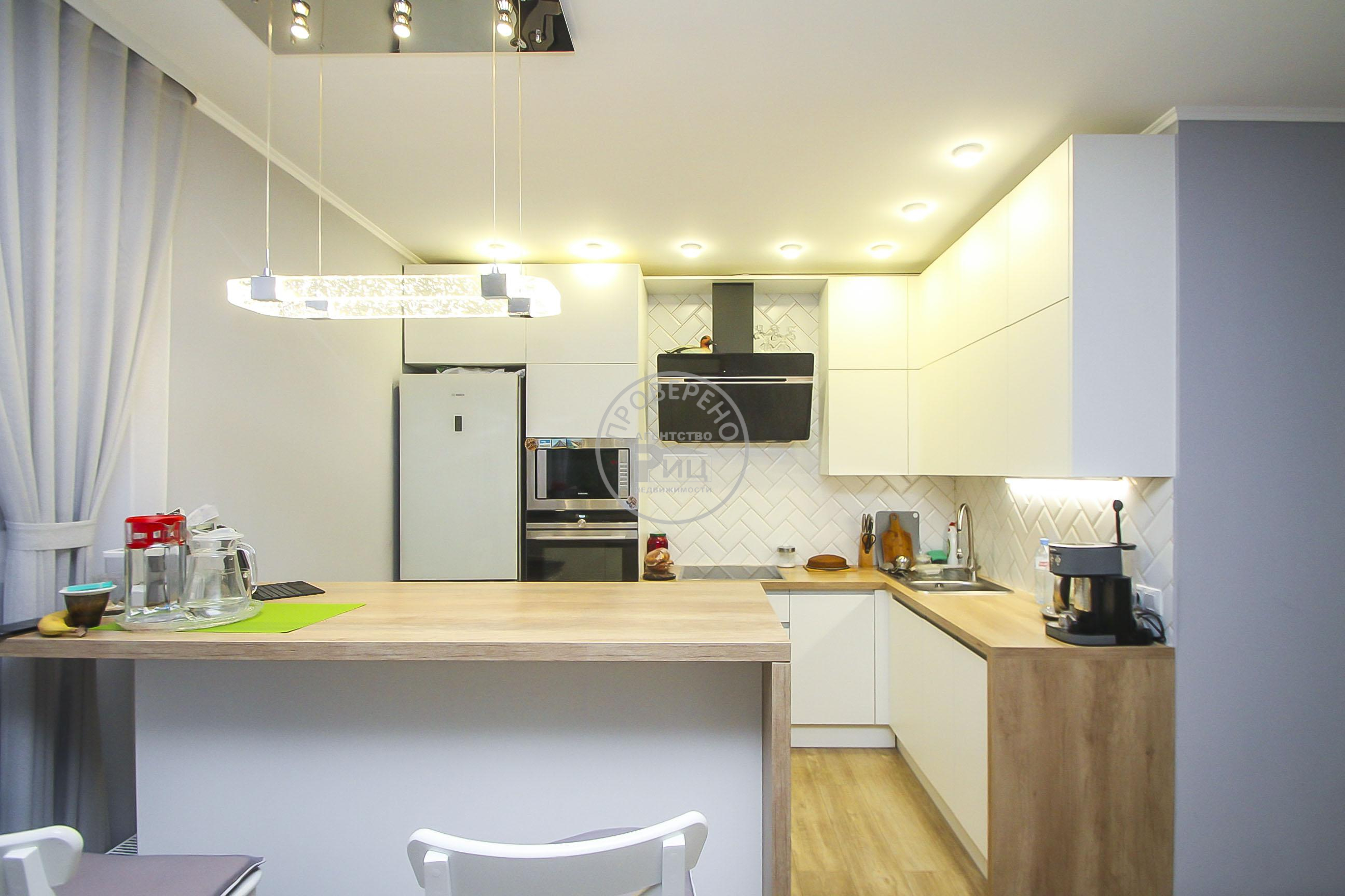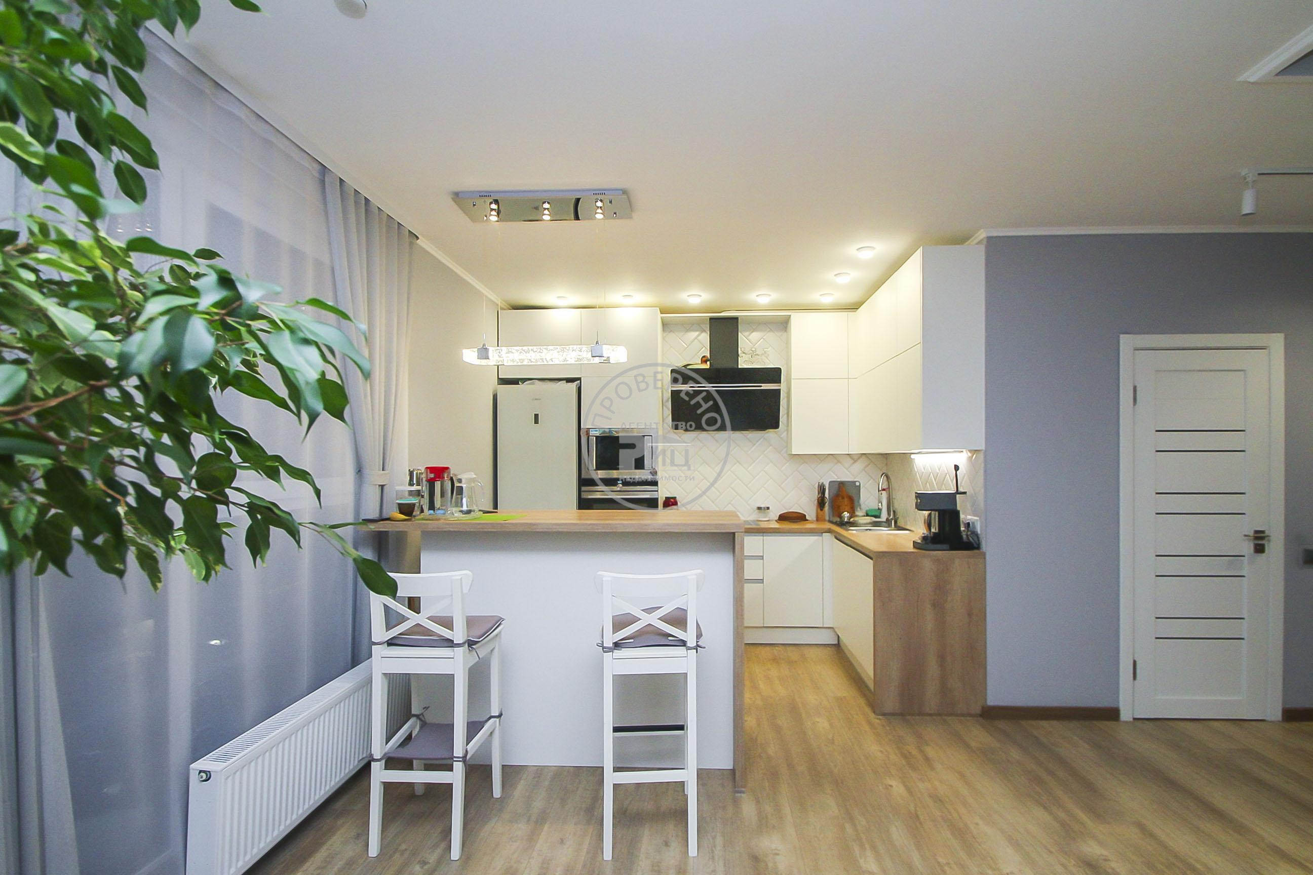 Светлая кухня гостиная- место притяжения всей семьи, с эксклюзивными панорамными окнами и выходом на утепленный балкон, просторная прихожая, совмещенный санузел и комната.